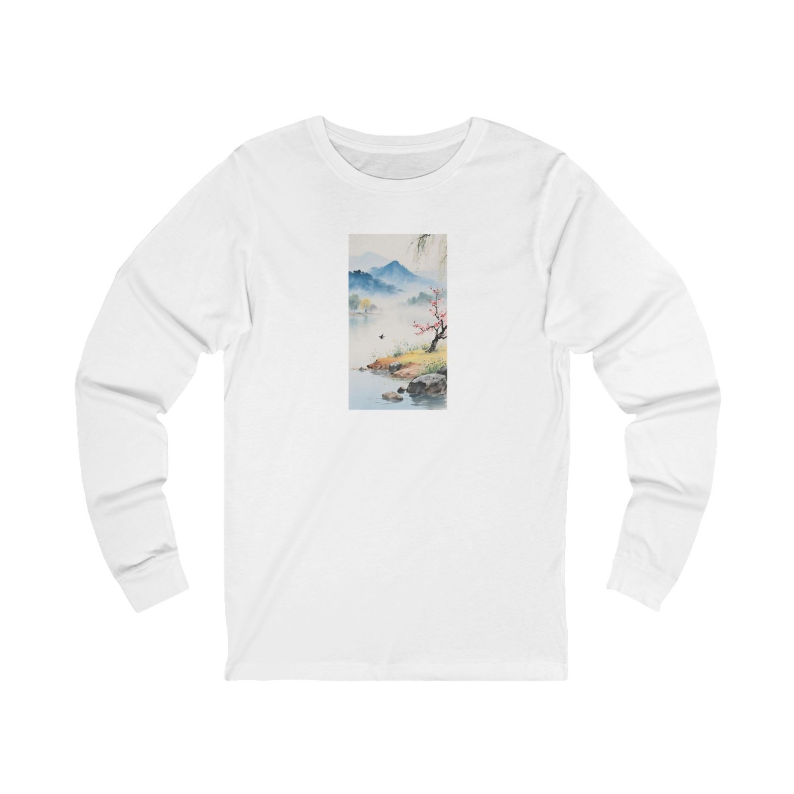 Scenic Mountain Lake Long Sleeve Tee — Japanese Watercolor Landscape